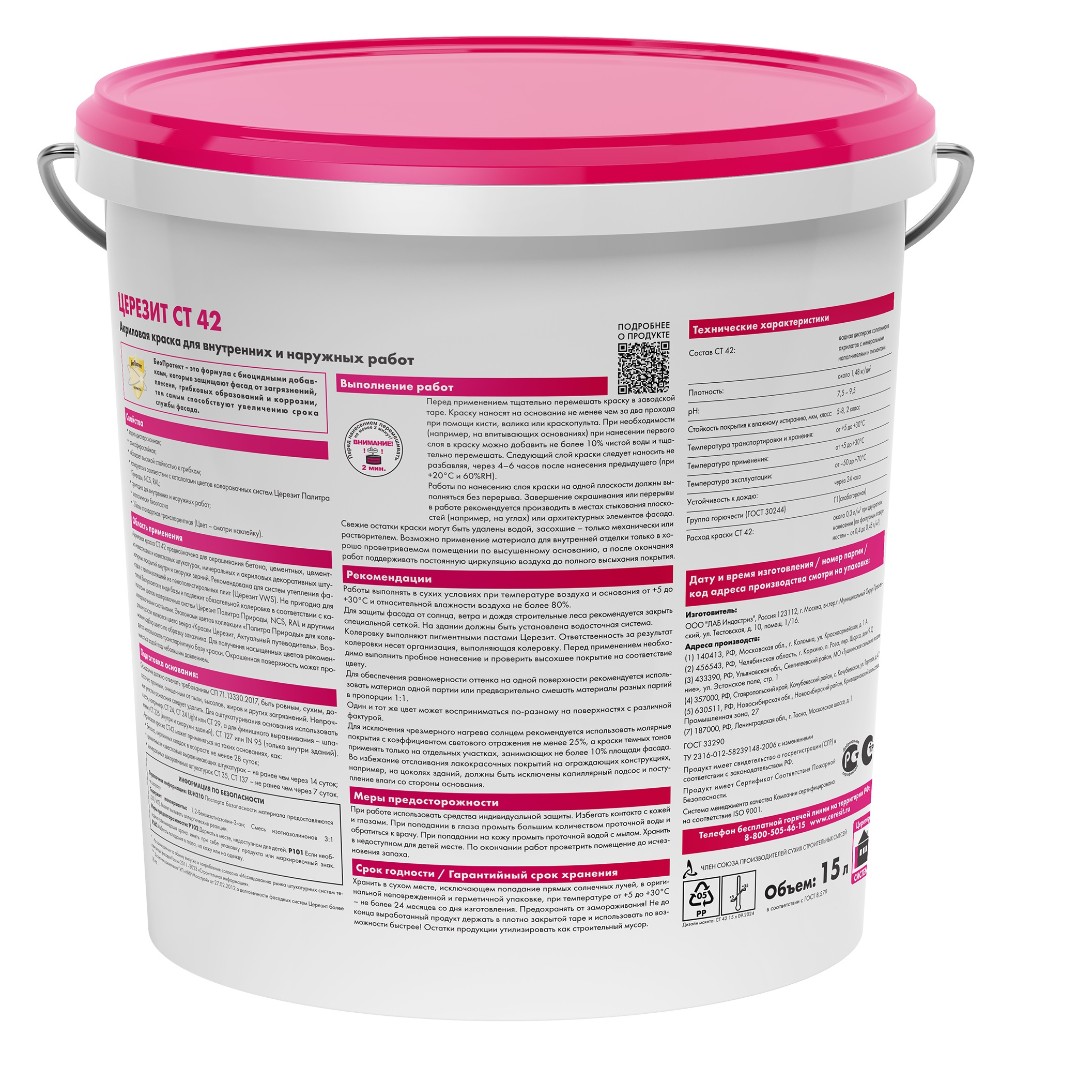 Краска СТ 42 — водно-дисперсионная краска, предназначенная для окрашивания минеральных и акриловых декоративных штукатурных покрытий, таких как CT 35, CT 137, CT 60, CT 63 и CT 64, а также бетона, цементно-песчаных, цементно-известковых и известковых штукатурок. Подходит как для внутренних, так и для наружных работ. Рекомендована для систем фасадной теплоизоляции с пенополистирольными плитами (Ceresit EPS).