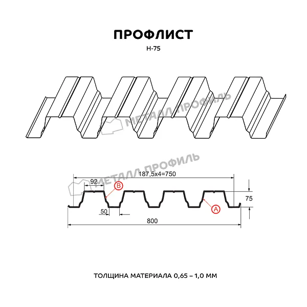 Профлист МЕТАЛЛ ПРОФИЛЬ Н-75x750-A (ОЦ-01-БЦ-0,9) — популярный материал в Нижнем Новгороде для оформления профилированного листа. Представляет собой лист оцинкованной стали с покрытием. Общая толщина металла с цинковым и полимерным слоем — 0.9 мм.Проходя процедуру холодного проката, металл приобретает рисунок из повторяющихся волн. Несущая способность профилированного листа на порядок выше плоского.